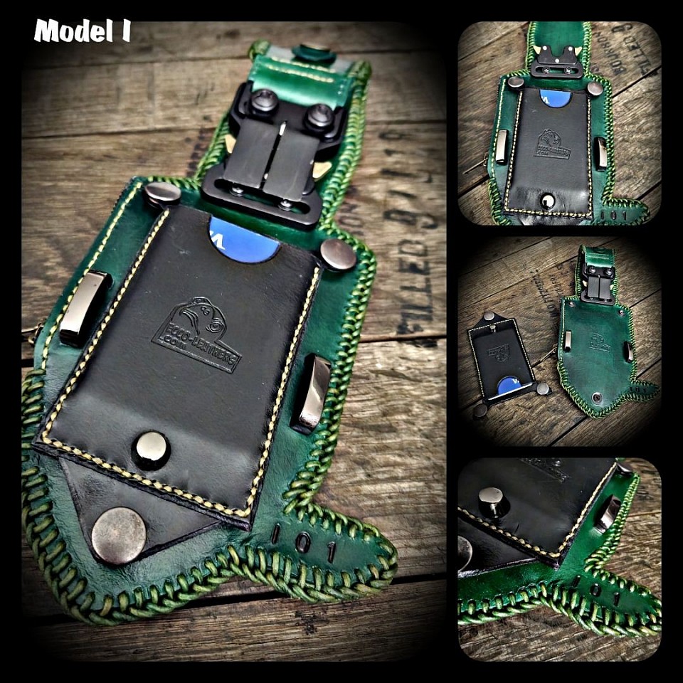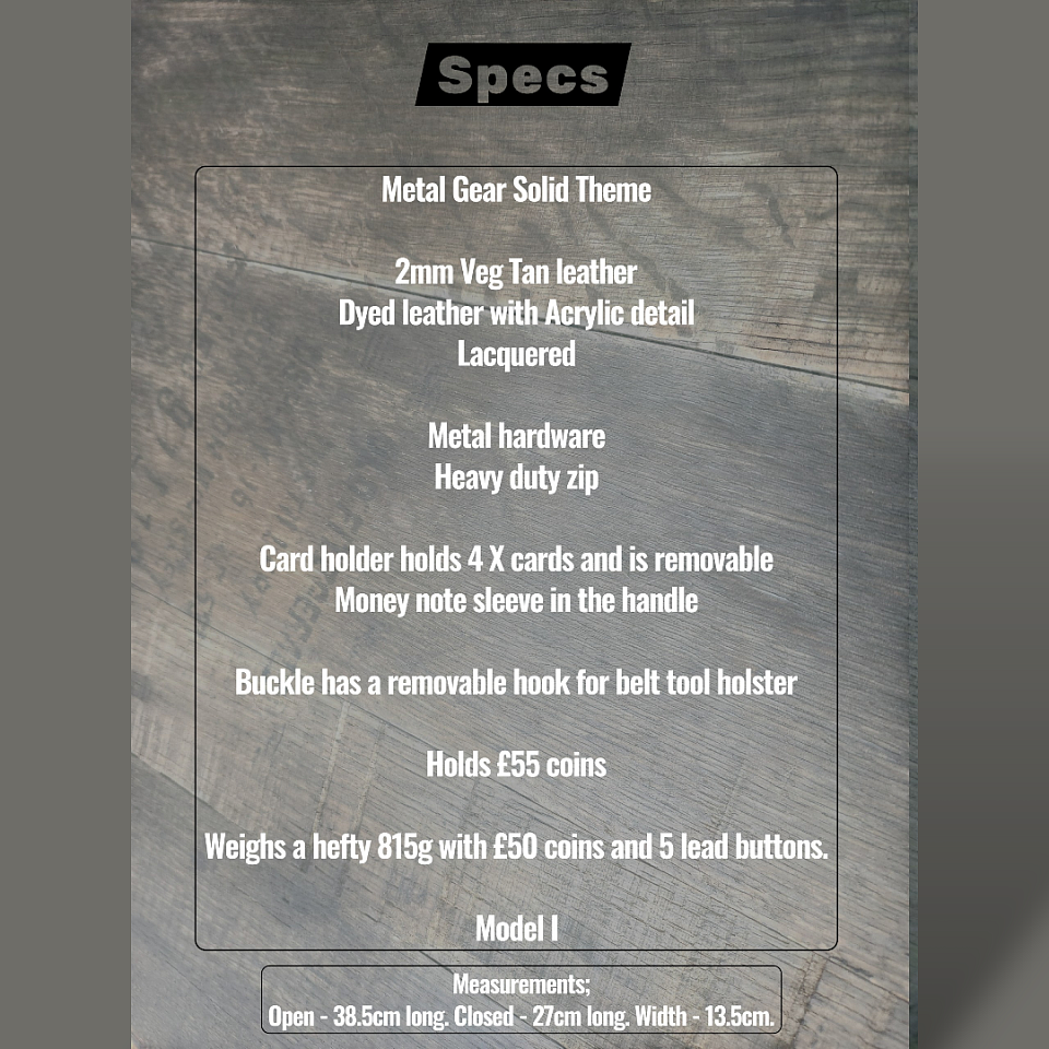 US Army themed. This one has 2x card slots and a slip for notes. Metal hardware. Dyed colours. Matte varnished. Holds upto £45 pound coins. Photographed containing £40 coins + 5 lead buttons, 2 x cards. 668g.